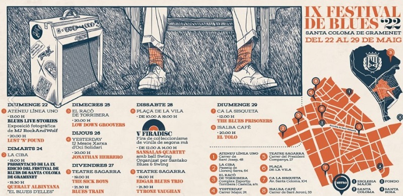 Aquest diumenge 22 de maig, comença el Festival de Blues a la nostra ciutat. Al llarg de vuit dies, aquesta novena edició d’un festival ja àmpliament consolidat, ens porta, com ja ens té habituats, un programa molt variat. Foto: Cartell oficial del Festival