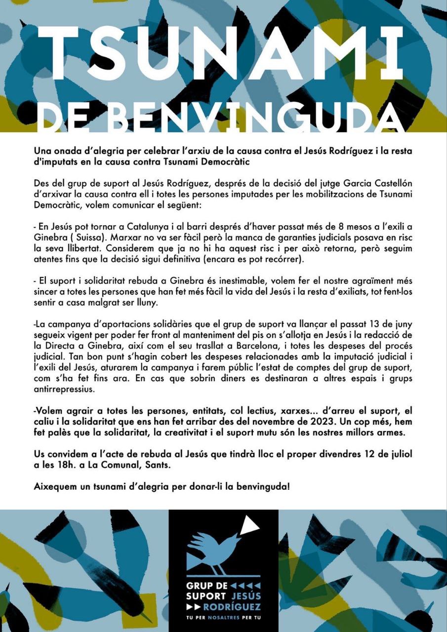 Aquí teniu el comunicat fet des de la plataforma de suport a Jesús Rodríguez.