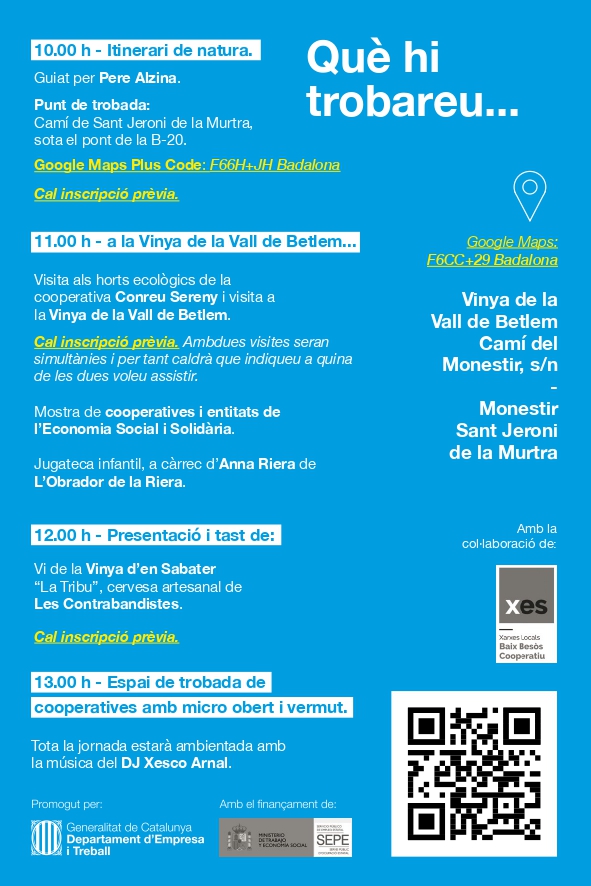 Un itinerari de natura per arribar al lloc de l’esdeveniment, una visita guiada als dos projectes cooperatius que s’ubiquen a Sant Jeroni de la Murtra -els horts ecològics de Conreu Sereny i la Vinya de la Vall de Betlem, un tast de vi i cervesa ecològics, amb espai infantil habilitat i ambientació musical seran les activitats. La jornada clourà amb un espai de vermut amb un micròfon obert on les cooperatives i projectes assistents podran presentar la seva feina, així com donar a conèixer els seus productes i serveis.