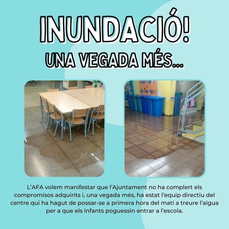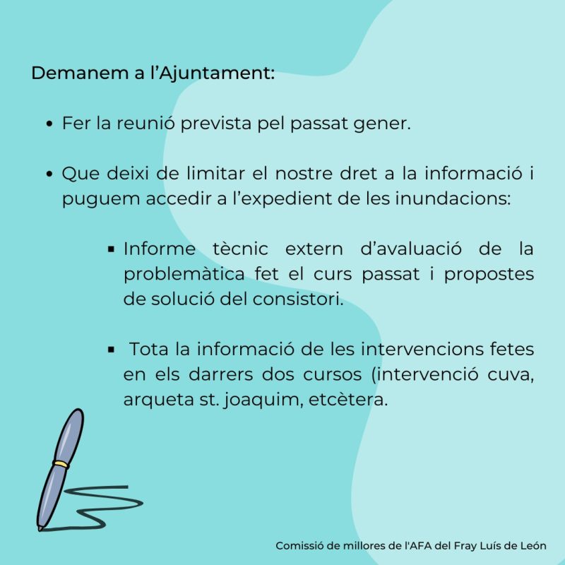 Durant la setmana de l’11 al 15 de març la comissió de millores de l’AFA de l’Escola Fray Luis de León està fent una recollida de signatures dirigida a tota la comunitat educativa del centre. Ho fan com a mesura de pressió perquè l’Ajuntament compleixi amb el compromís adquirit el passat mes de setembre de celebrar una reunió de seguiment sobre la problemàtica de les inundacions que pateix l’edifici cada vegada que hi ha pluges abundants. També demanen que es faciliti tota la documentació negada fins al moment tot i la demanda reiterada per part de les famílies.