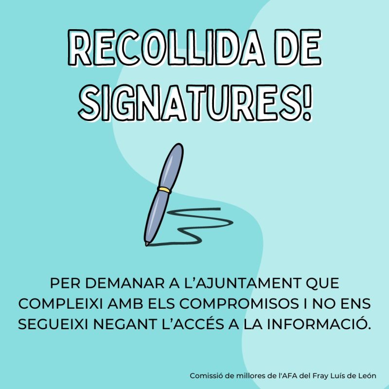 2 thoughts on “L’AFA del Fray Luis de León recull signatures per demanar a l’Ajuntament transparència”