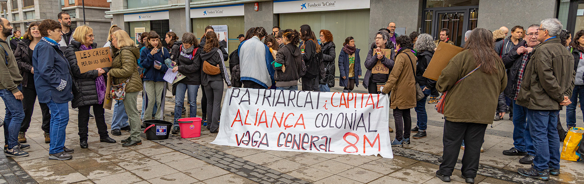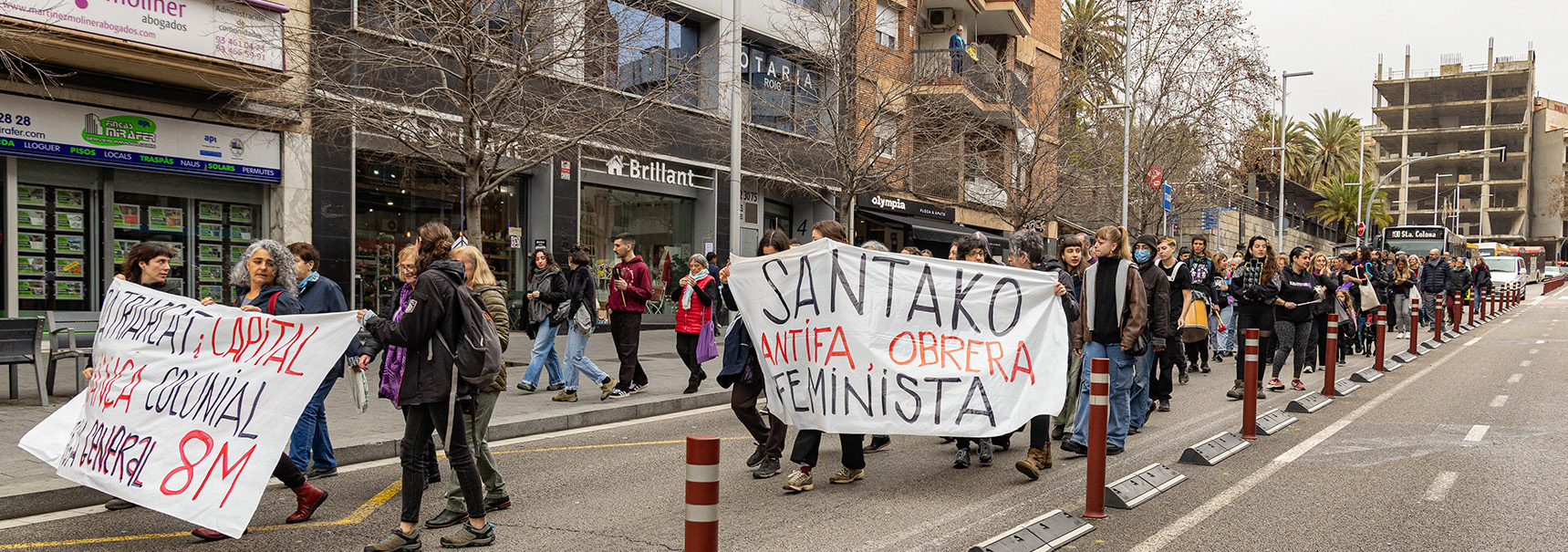 La manifestació va continuar, amb consignes contra el patriarcat i de denúncia de la desigualtat que patim les dones i la seva expressió extrema que és la violència masclista, fins al pirulí de la pl. Vila on es va fer un al·legat en pro del dret a l’habitatge digne i la denúncia dels nombrosos desnonament que tenen lloc a la nostra ciutat setmanalment. També es va recordar la lluita contra el PERI Santa Coloma Vella II.