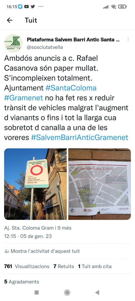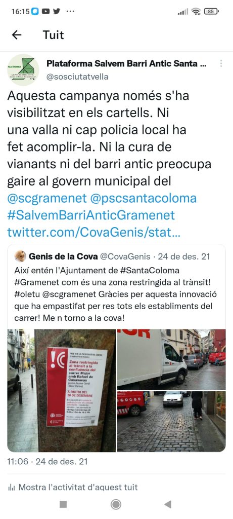 L’Ajuntament de Santa Coloma de Gramenet va anunciar el tall de circulació de vehicles no autoritzats pels carrers Rafael Casanova i Major a causa de la Campanya Nadal. Una any més, la restricció s’ha incomplert perquè el mateix Ajuntament no adopta mesures per executar-la. De nou, la Plataforma Salvem el Barri Antic ho ha denunciat a les xarxes. Foto capçalera: Albert Azurmendi