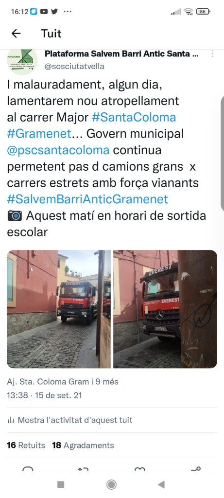 La reivindicació que el nucli antic de Santa Coloma de Gramenet esdevingui de prioritat per als vianants és una de les centrals de la Plataforma des de la seva constitució. La demanda esdevingué denúncia quan a mitjans de setembre de 2021, una veïna era greument atropellada per un camió municipal al carrer Major cantonada carrer Sant Domènec. Un greu accident que, malauradament era (i és encara) previsible a causa de l’amplada reduïda de bona part de les vies del barri.