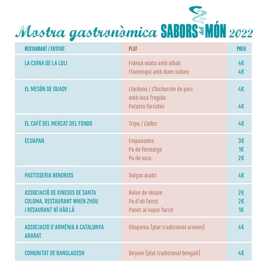 “Els sabors del món, festa gastronòmica i lingüística”, així es definia aquesta jornada en la seva segona edició, allà pel 2013. Havia arrencat un any abans, el 2012, amb un gran èxit de participació d’expositors i de públic, el qual es reeditava any rere any de la mà de Fondo Comerç. Les primeres edicions duraven tota la jornada, fins les 20.30h-21 h del vespre, i aconseguien aplegar fins a una vintena de nacionalitats pel tastet de plats del món.