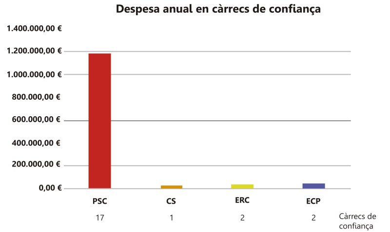 En 2019, la despesa anual ascendia a 1.188.537,74 €. Els de caràcter directiu han estat fins ara de 8 i els d’assessorament van començar sent 9 però se’n va destituir un fa dos anys, del qual no s’indica la seva remuneració anual fins en aquella data però en l’anterior mandat era la més elevada.