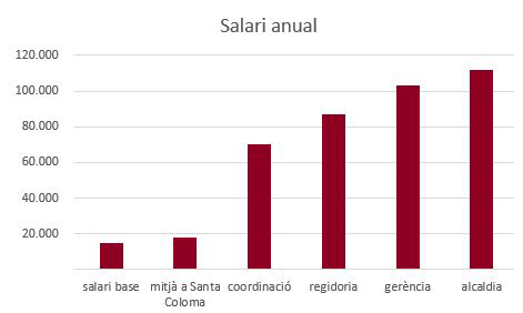 - El màxim sou en 2015 era el del director d’Alcaldia amb 70.000 euros. Actualment el més elevat és el del gerent amb 102.996,63 euros, un sou que supera al màxim que podria rebre l’alcaldessa si cobrés de l’ajuntament i al mateix president de l’estat espanyol, Pedro Sánchez, que rep 90.010,20 euros.